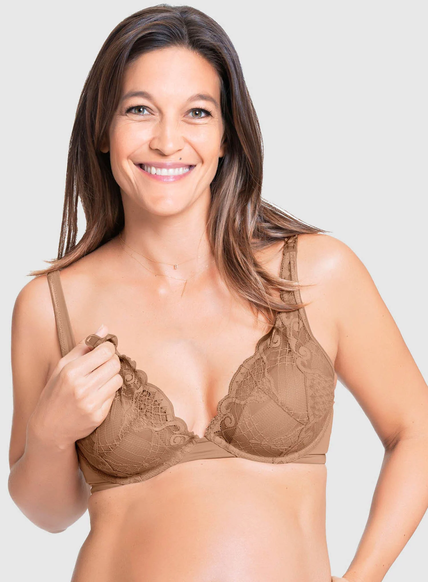 CAKE LINGERIE Truffle Moulded Plunge Maternity Bra features innovative flexible plunge wires. A welcome addition to maternity bras without compromising on fit. This bra offers a 3/4 sexy plunge front with the practicality for everyday wear with its flat engineered lace for t-shirt wear. The cups are lined with brushed cotton creating a very comfortable feel against your skin. This maternity bra offers optimum shape with added side support and a plush sling with easy drop-down cups for feeding.