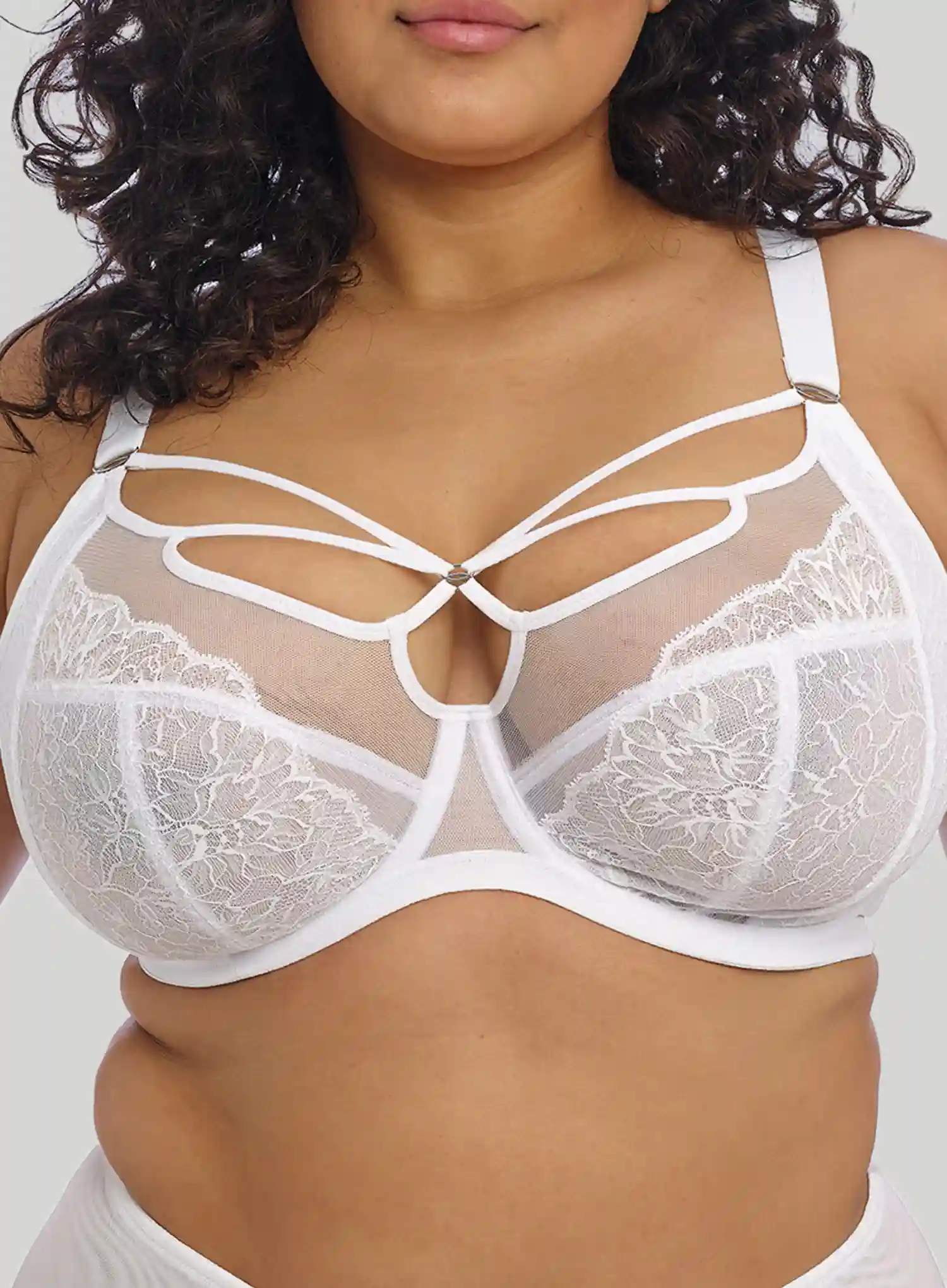 ELOMI BRIANNA Underwired Plunge Bra White is a stunning, fashion-forward addition to the Brianna collection. With its flat lace and floral design, this bra creates a feminine, confident look, while strappy cage detailing at the centre front adds modern sophistication—perfect for low-cut tops or as a statement piece on its own.