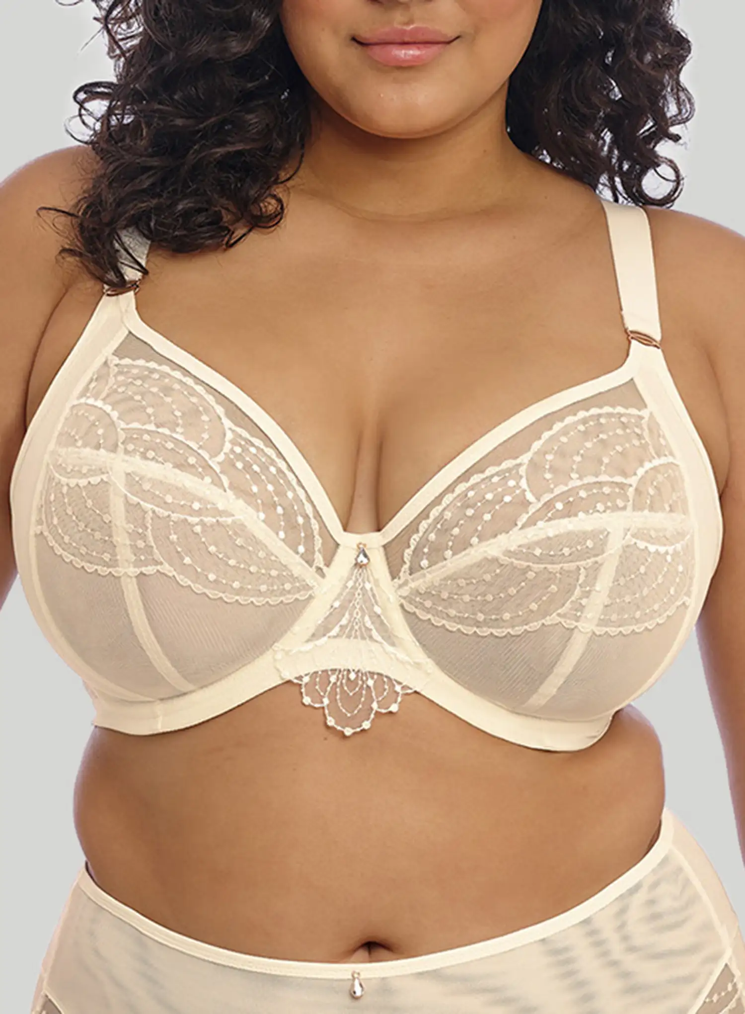 ELOMI Priya Underwired Plunge Bra in Vanilla is a treat for your lingerie drawer. The Priya collection embodies all things 1920s glamour. Draped beading, embroidery inspired by decadent chandeliers, and the under-bust tattoo style panel set this collection apart. DeBra's Fitting Consultants describe it as a deliciously luxurious feel bra. The always elegant Priya is available in a new demure vanilla, perfect for all occasions.