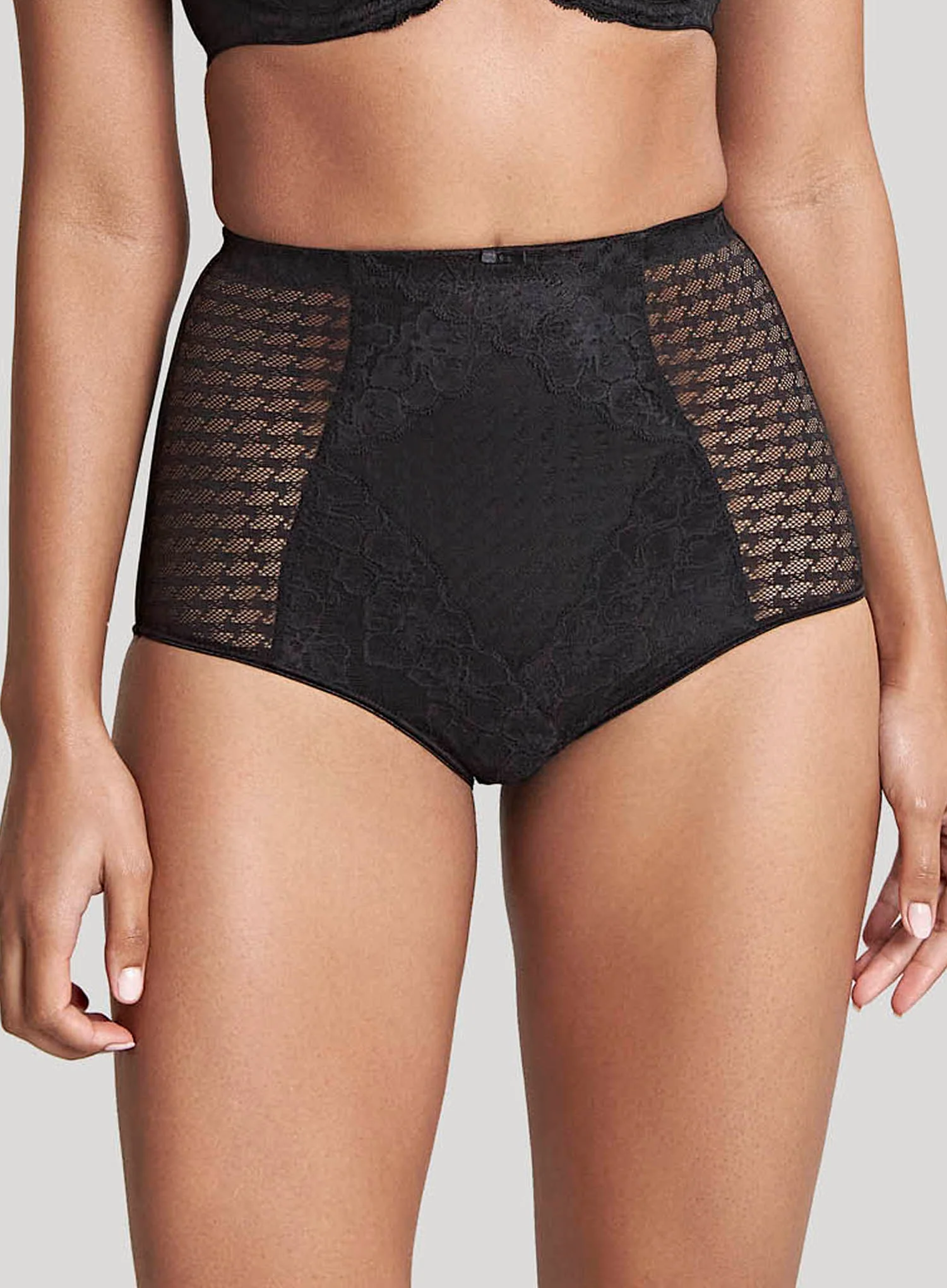 PANACHE. Envy High Waist Shaping Brief in Black features a bold hounds-tooth jacquard with floral floss lace, giving it a luxurious, feminine feel. This high waisted brief features a support panel at the front offering medium control for a flattering look. The lace leg panel prevents any visible panty line.
